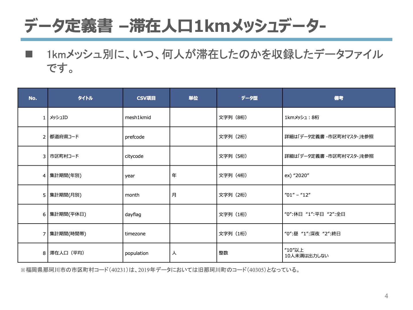 「全国のオープン人流データ」のファイル形式を確認しておきます。 オープンデータ(人流データ)定義書によれば、1 kmメッシュデータのCSVファイルには、以下の図に示すデータが入っています。