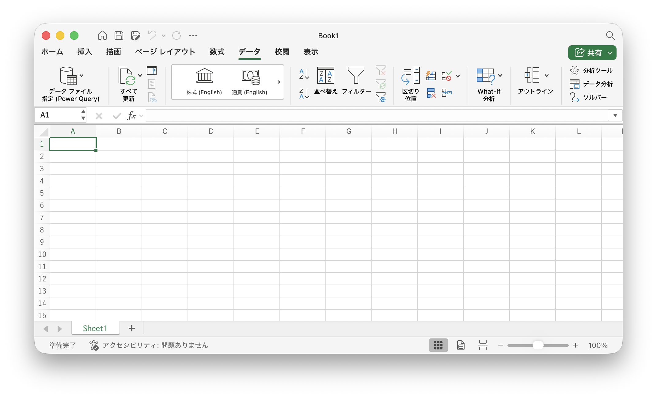 - Excelで新しいファイルを開き、[データ]タブをクリックします。