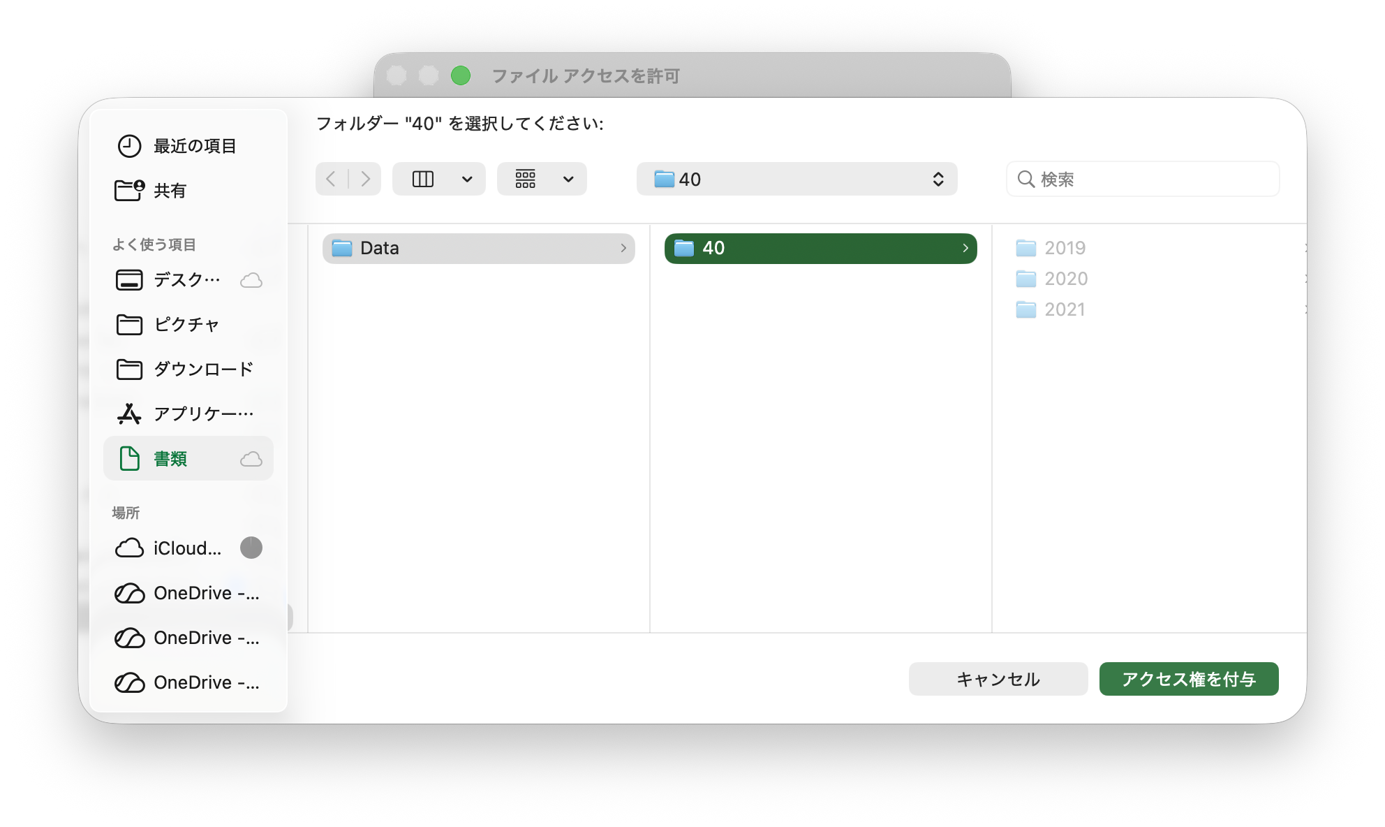 - フォルダ選択ウィンドウが開くので、「40」フォルダが選択されていることを確認して、[アクセス権を付与]をクリックします。