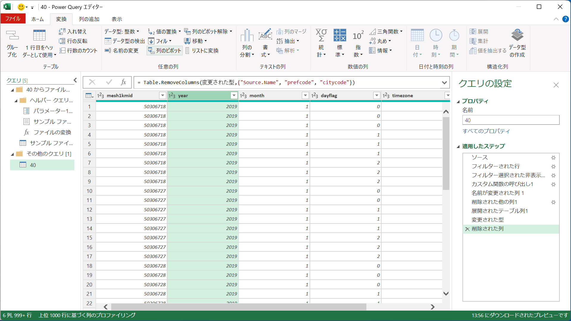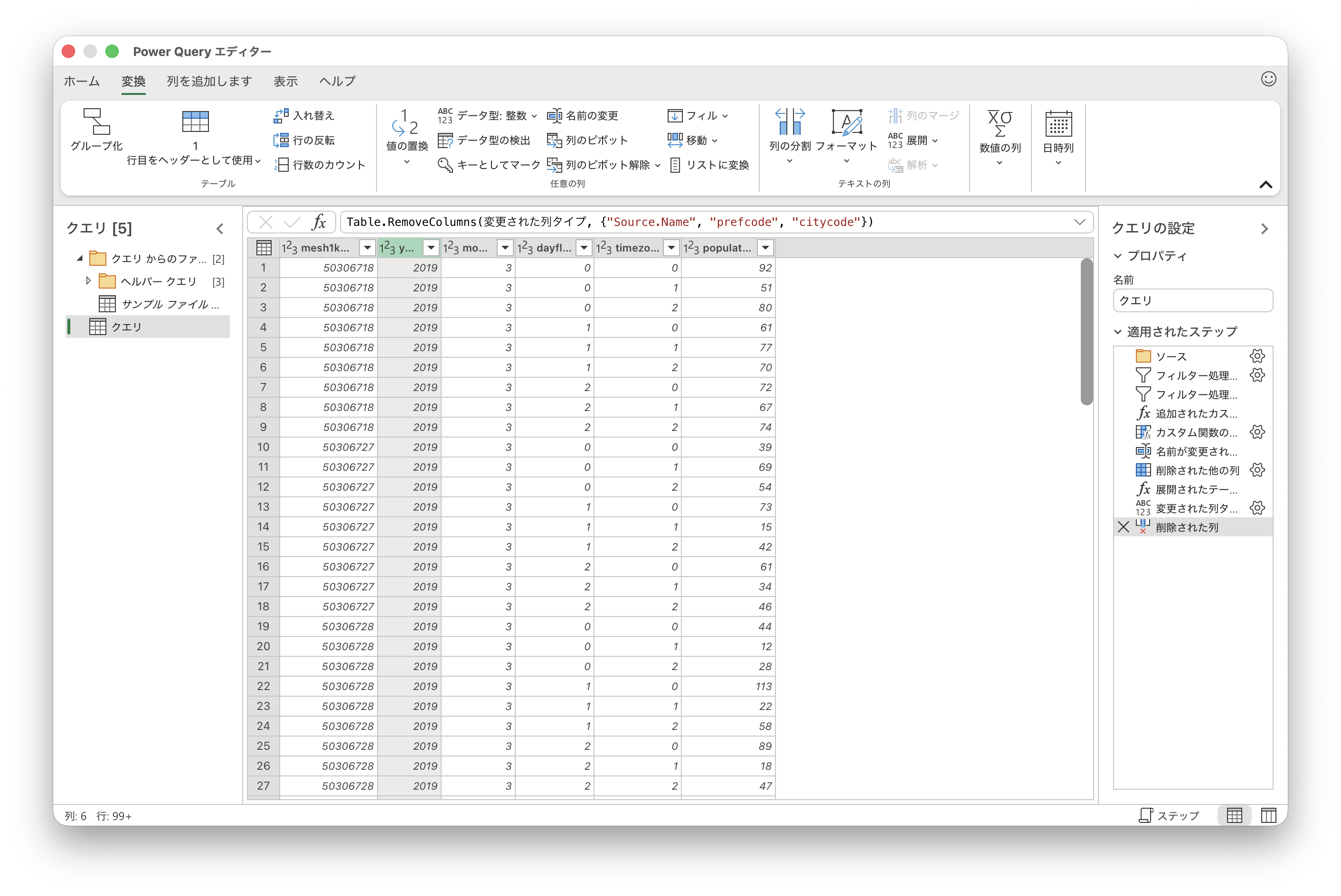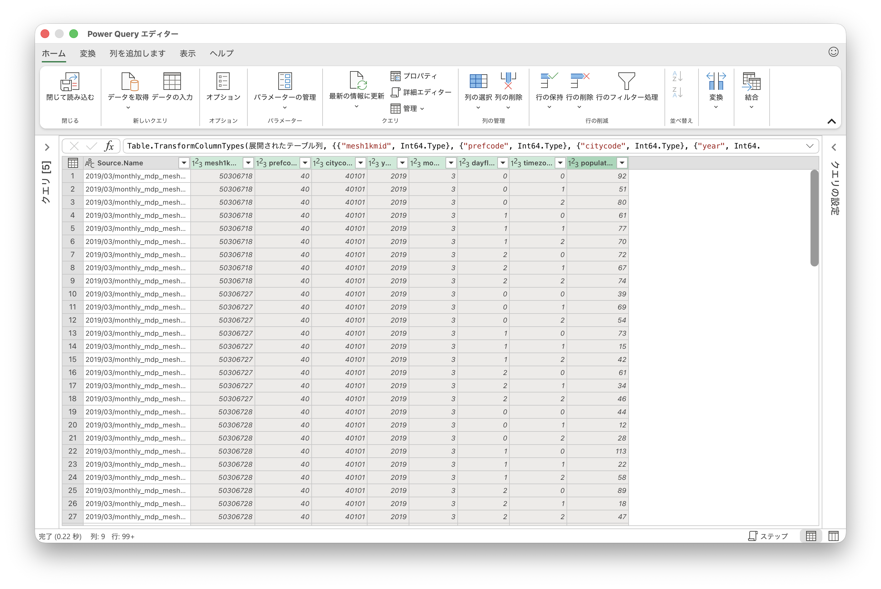 - 下図のようなテーブルが表示されます。 後の処理を軽くするために、テーブルをシンプルにしておきます。 「Source.Name」「prefcode」「citycode」の3つの列を削除します(順番に、列名を右クリックして「列を削除」をを繰り返します)。
