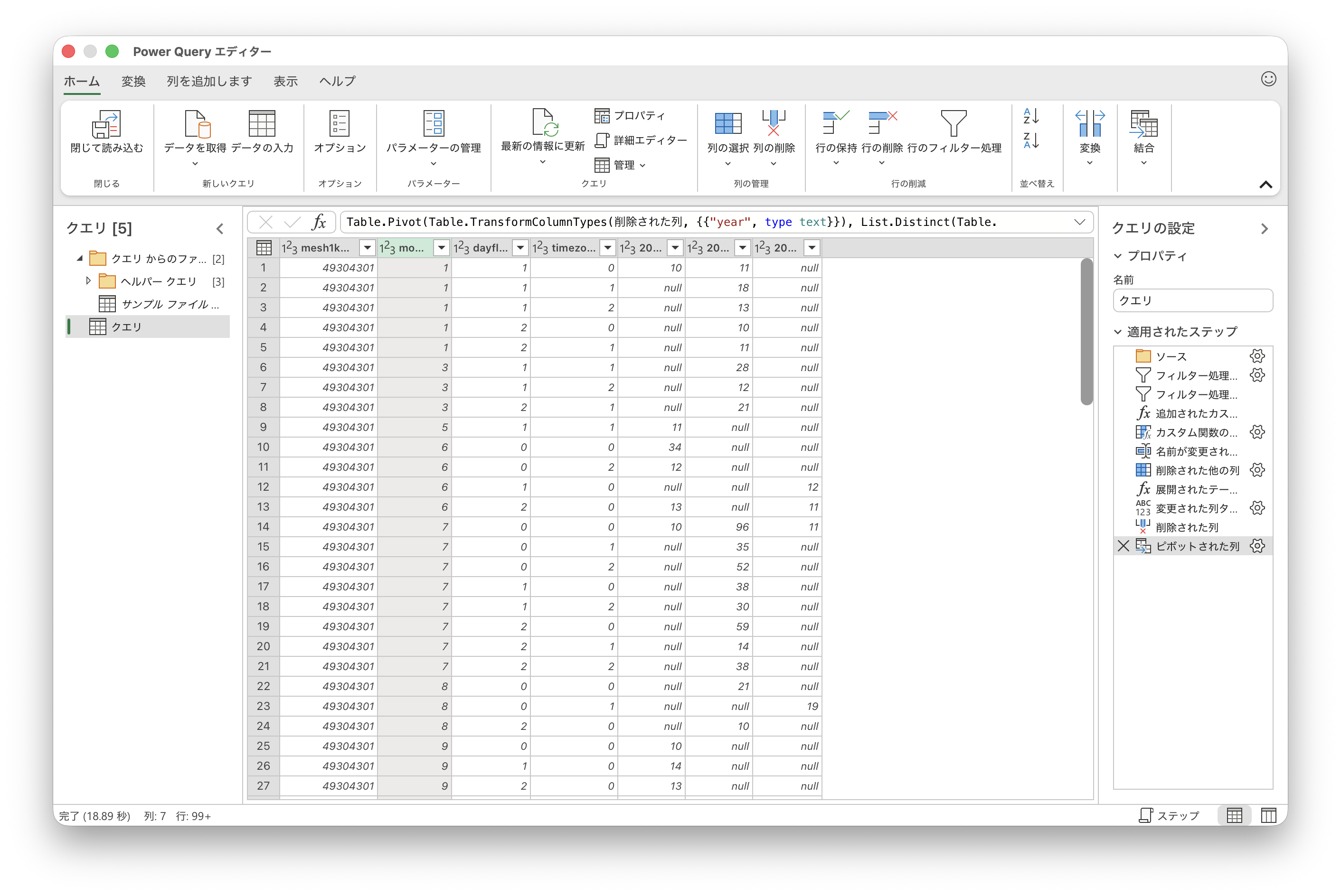 - データのピボットを行います。 具体的には、「year」列のデータ(2019、2020、2021)をそれぞれ列名にして、列のデータにそれぞれの年の「population」列の数字が表示されるようにします。 まず、「変換」タブをクリックします。 次に「year」列を選択した状態で、[列のピボット]をクリックします。