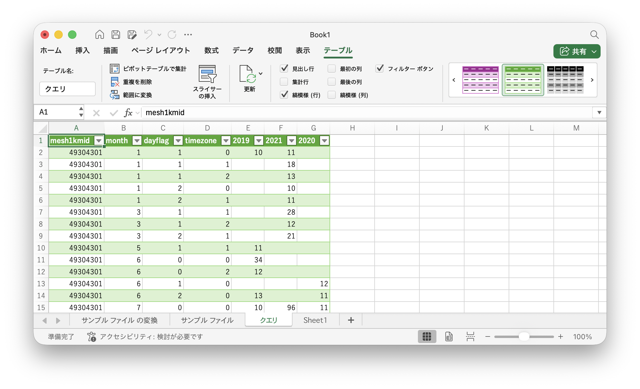 - 「クエリ」シートに、下図のようなデータが表示されます。 このExcelファイルに名前をつけて保存しましょう。