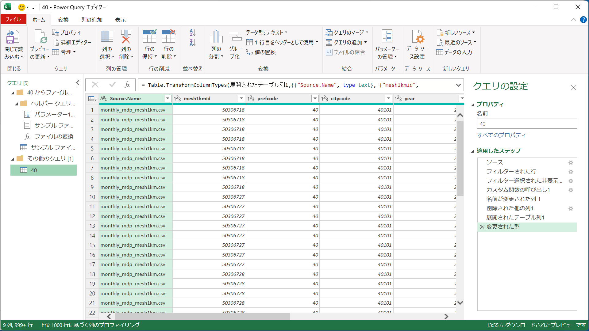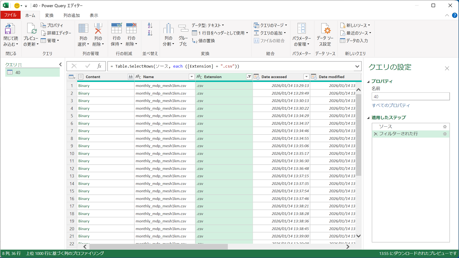 - Power Queryエディターのウィンドウが開きます。表示されている内容は先ほどと同じで、「40」フォルダ以下にあるファイルのリストです。