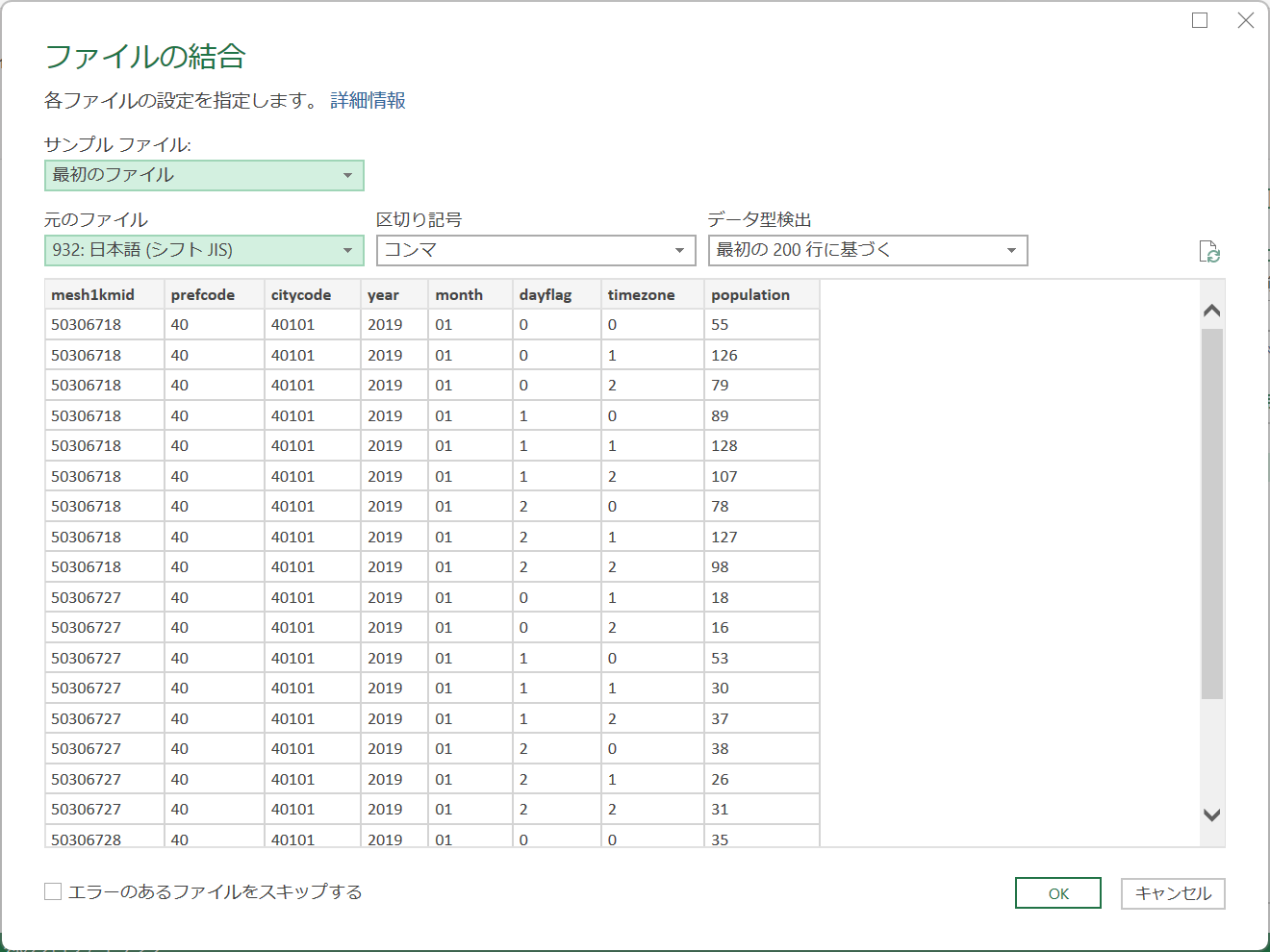 提供されているCSVファイルは月毎のファイルに分かれていますが、データの中に「年」と「月」のデータ項目があることから、すべてのデータを縦に繋げて1つのファイルにしても、問題がない(重複なくデータを特定できる)ことがわかります。