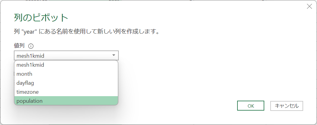 - 「列のピボット」というウィンドウが開きます。 [値列]のプルダウンメニューから「population」を選択して[OK]ボタンをクリックします。