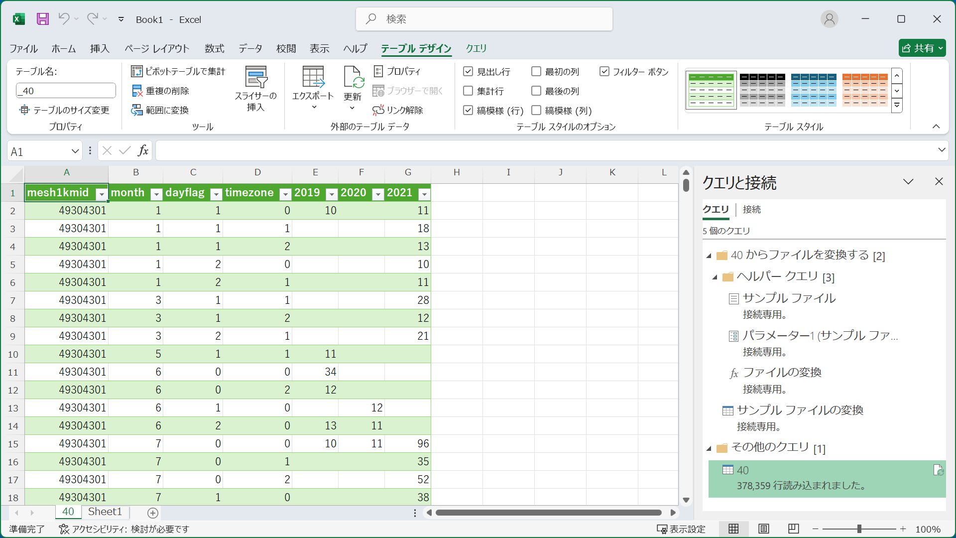- 「year」「population」の2列がなくなって、「2019」「2020」「2021」の3列が追加されているのを確認します。 [ホーム]タブをクリックし、[閉じて読み込む]をクリックすると、クエリをExcelに読み込みます。 そのままクエリの実行が完了するのを、気長に待ちます。