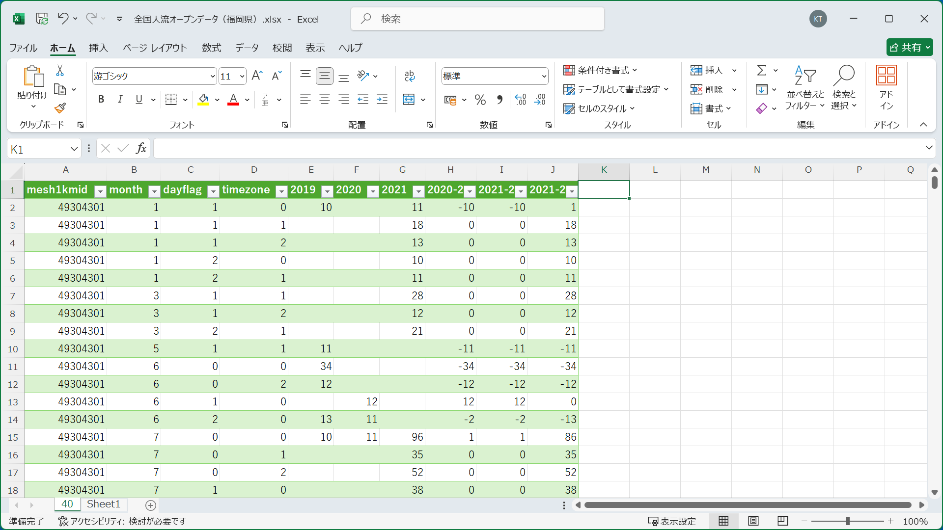 - 「40」というシートが追加され、下図のようなデータが表示されます。 このExcelファイルに名前をつけて保存しましょう。