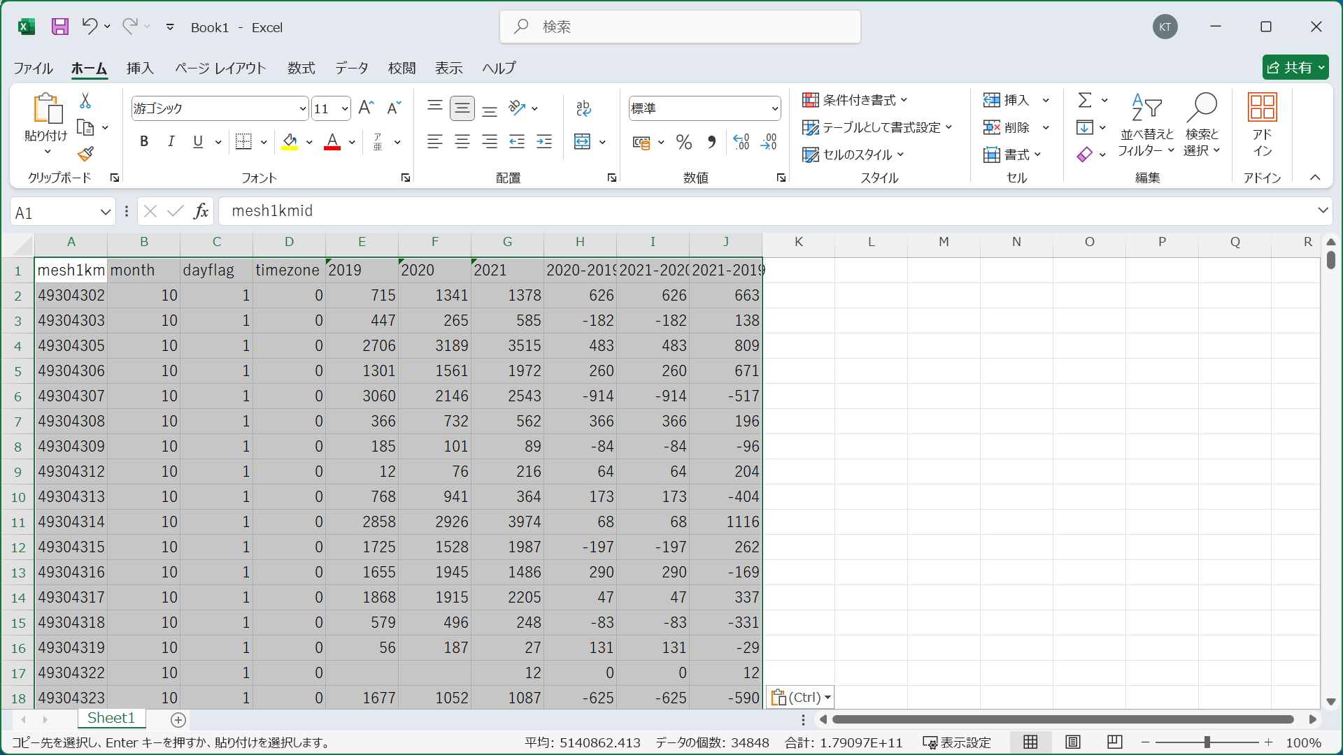 Excelを使って、「全国の人流オープンデータ(滞在人口1 kmメッシュデータ)」の差分を計算する方法を示します。