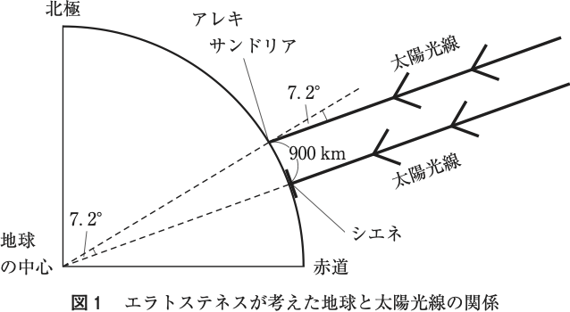 - シエネの北900 kmの地点にあるアレキサンドリアで夏至の日の南中高度を計測