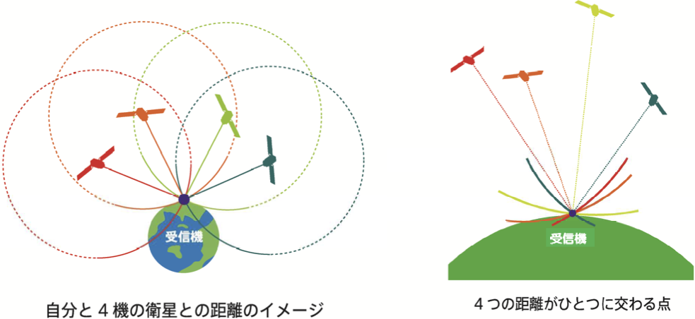 - 原理的には、3つの衛星からの信号が受信できれば、受信機の緯度経度が分かる(受信機の時計に誤差があるので、正確な時刻を求めるために4機目GPS衛星の情報が必要)
