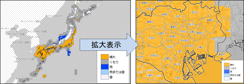気象庁ホームページに掲載している天気分布予報の例(https://www.jma.go.jp/jma/kishou/know/kurashi/bunpu.html)